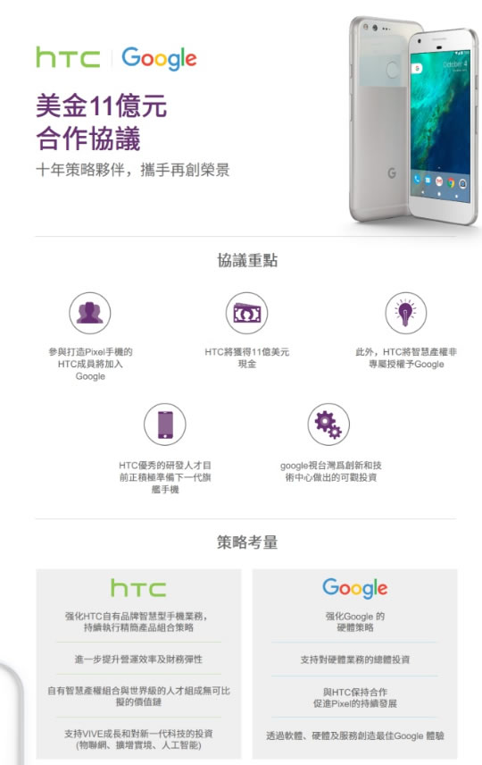 具体而言,Google将延揽原参与打造 Pixel手机的HTC团队成员及相关员工加入Google,并买受HTC部份相关资产,同时HTC将就部份知识产权非专属授权予Google。HTC表示协议强化HTC专注创新与自有品牌智能手机发展。