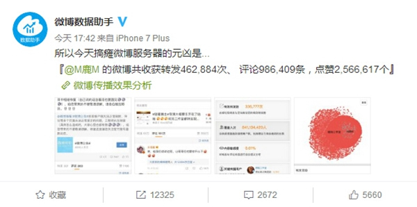 官方已经暗示此次微博出现问题的原因可能是来自于明星鹿晗,微博数据助手在今天晚间公布数据称,今天搞瘫微博服务器的元凶是鹿晗的“表白”微博,统计时共收获转发462884次,评论986409条,点赞2566,617个,可能是今天最热门的一条微博。