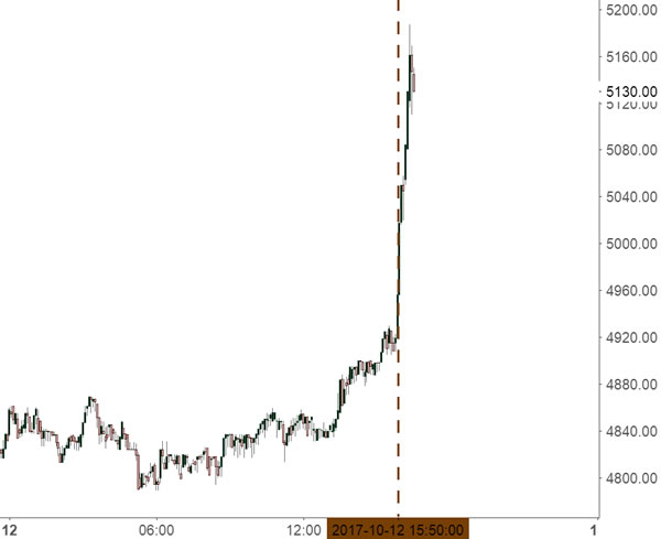 据bitcointicker显示,比特币实时价格突破 5000 美元,截至北京时间16:22:32,其最高价格已达5167. 5 美元。比特币在短短半个小时内暴涨超 150 美元,突破 5000 美元大关,再刷历史新高。