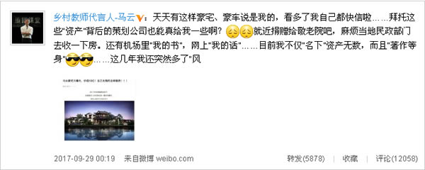 今年9月,马云曾通过微博对此类“豪宅”传闻回应,称“看多了我自己都快信啦”。他还一并回应了机场马云著作、网上马云语录,以及网络上所谓的“风水大师”“策划师”“私人助理”等诸多传闻。