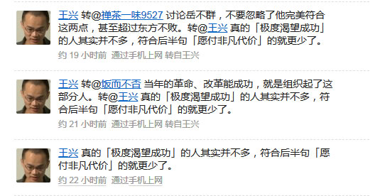 随后,王兴转发网友@饭而不否 的跟评:当年的革命、改革能成功,就是组织起了这部分人。转发@禅茶一味9527 的跟评:讨论岳不群,不要忽略了他完美符合这两点,甚至超过东方不败。