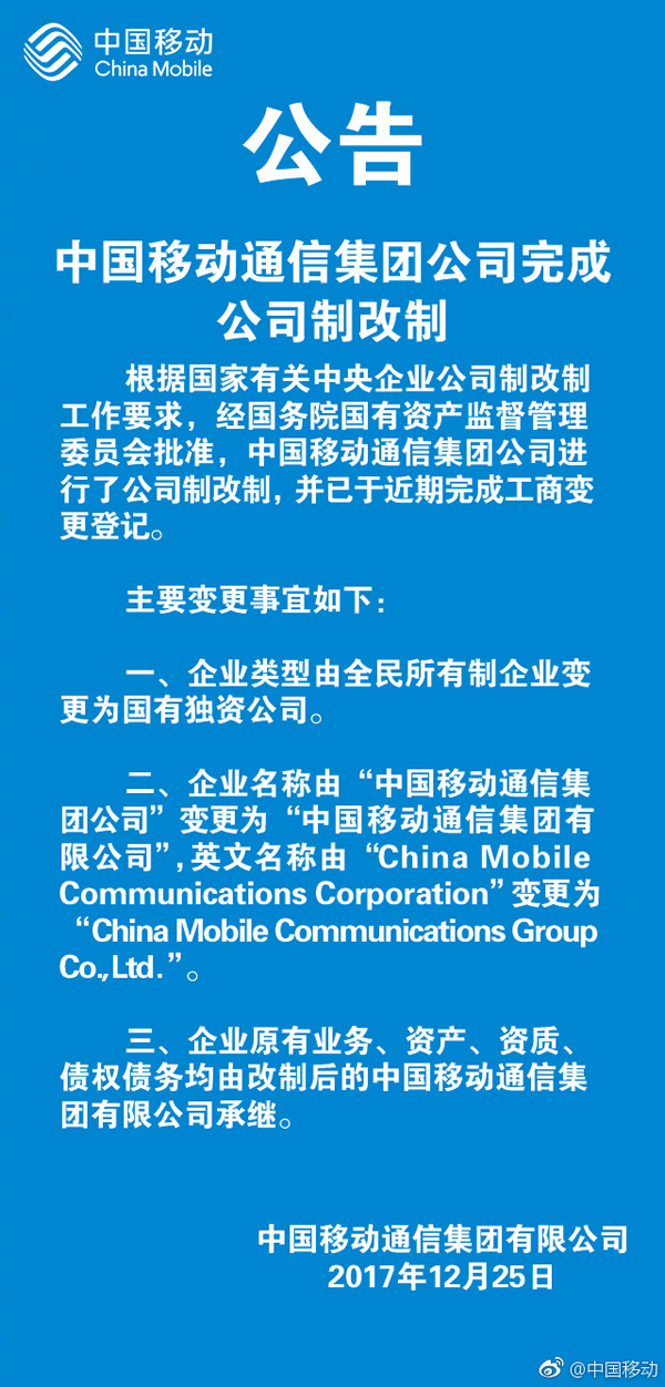 中国移动官方发公告称, 根据国家有关中央企业公司制改制工作要求,经国务院国有资产监督管理委员会批准,中国移动通信集团公司进行了公司制改革,并于近期完成工商变更。