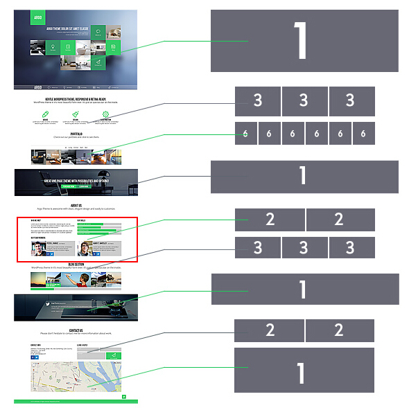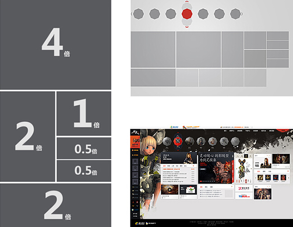 还有一种网页格局方法:小切糕;是根据屏幕的宽度进行计算。通常在设计时会有一个基础的最小切糕,然后以2倍、3倍、4倍的方式进行拓展,并计算出最适合完整的组合。如图所示: