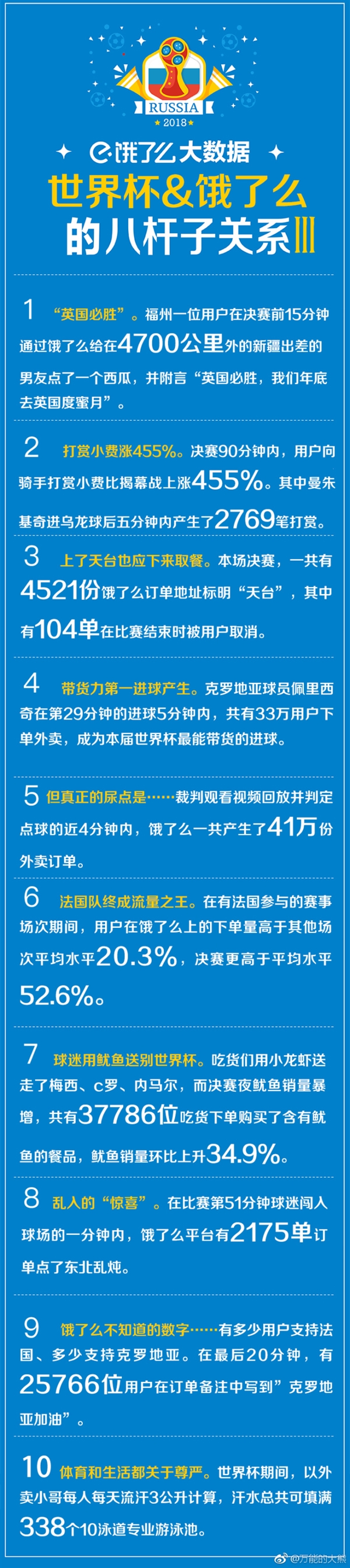 决赛结束后,外卖巨头饿了么汇总了决赛之夜产生的外卖数据并公布,让人不得不佩服这届球迷竟然如此有才。