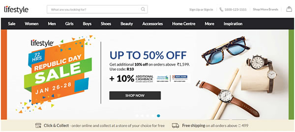 Lifestyle会在主页中及时更新最新的优惠活动,并把折扣最大的商品放在头版,如下图 Lifestyle还着重强调了“Sale(大减价)”。