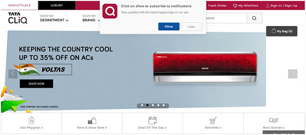 一进入这家著名的印度商店,首先你会看到一个订阅通知框跳出,提醒人们订阅他们的信息。Tata Cliq主打特定的品牌,并展示品牌相关最优惠产品,值得注意的是,它们在所有的大减价商品旁都贴上了“wow”贴纸,来营造兴奋感。