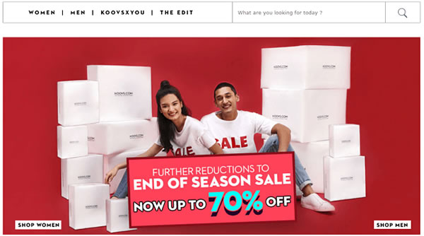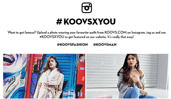 Koovs主页简单而时尚,主页中心直接展示了店内最具性价比的产品。此外,Koovs有一个名为“Koovsxyou”的页面,里面展示了用户穿着Koovs产品拍的照片,这对网站吸引潜在消费者购物有很大的作用。