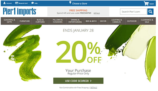 优惠券代码、奖励卡、“x %折扣”这些都是访客进入网站期待看到的东西,能有效给网站带来转化,而Pier 1的主页正是如此。Pier 1非常了解客户的心理,并鼓励客户通过推荐其产品或其它简单的任务来获得奖励卡。