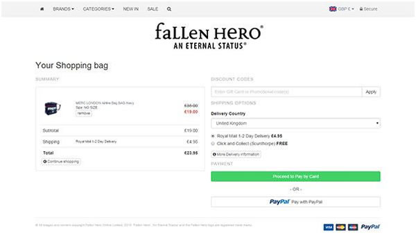 Fallen Hero网站另一个让人印象深刻之处在于,其网站结账流程非常流畅,顾客无需注册账户就可以购物。