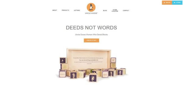 Uncle Goose专门生产字母积木套装,其主页给人的第一印象就是空间感,这使得这家商店的整体外观变得非常漂亮。同时,主页的图片和大写字体还不会影响到访客的观感。
