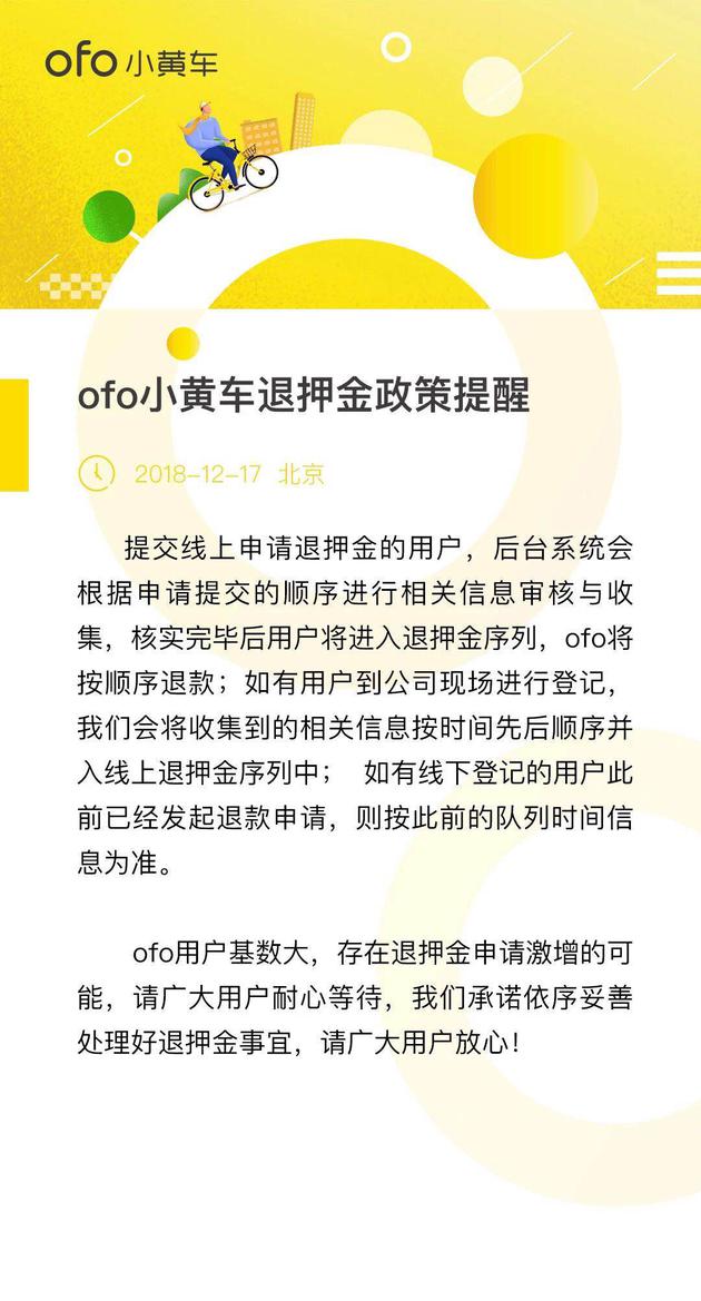 ofo小黄车提醒所有用户,自 2018 年 12 月 18 日起,凡在App内提交线上申请退押金的用户,后台系统会根据申请提交的顺序进行相关信息审核与收集,核实完毕后用户将进入退押金序列,ofo将按顺序退款;如有线下登记的用户此前已经发起退款申请,则按此前的队列时间信息为准。