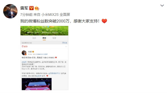 没想到,雷军的微博粉丝突破 2000 万了。