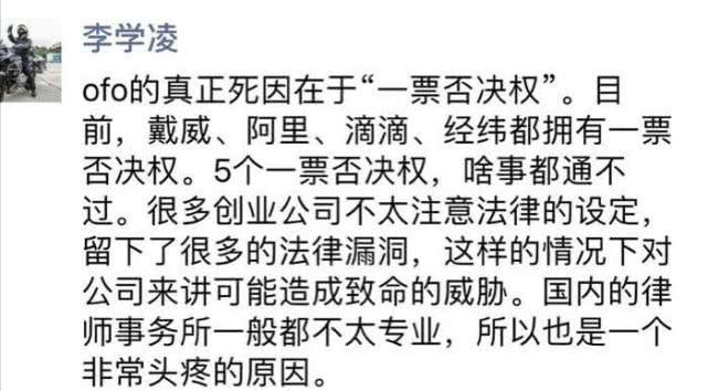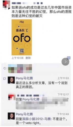 不过,腾讯CEO马化腾对此评论称,该文并没有说到真正的原因,真正的问题是在于“veto right(否决权)”。此外,欢聚时代董事长兼CEO李学凌也在其朋友圈发出了相同的观点,称ofo真正的死因在于“一票否决权”。