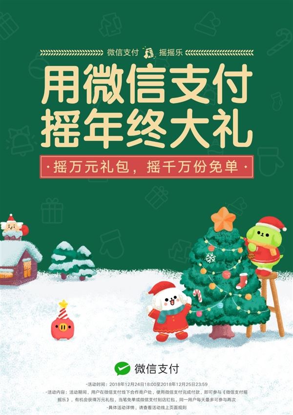 今日,微信支付官方发布活动海报称,今晚18:00起,使用微信支付并且使用摇一摇功能,就有机会获得年终万元大红包。