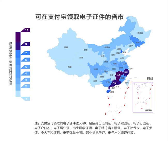 江西也异军突起,以可“领证”数量 56 种跃居全国第一。今年春节期间,江西一对夫妇去派出所办事,忘带结婚证差点白跑一趟,在支付宝内领取电子结婚证,顺利办完了事。