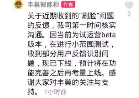 对此,丰巢智能柜方面回应称,关于近期收到的“刷脸”问题的反馈,我司第一时间核实沟通。因当前为试运营beta版本,在进行小范围测试,收到部门用户反馈识别问题,现已下线,预计将在功能完善之后再考虑上线。