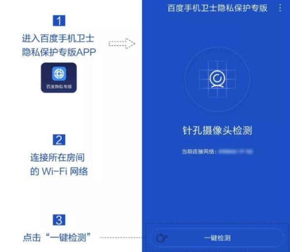 近年来,酒店暗藏针孔摄像头用户隐私的情况越来越普遍。然而,由于针孔摄像头个头太小,人们往往无法察觉。近日,针对针孔摄像头偷拍,百度推出了百度手机卫士隐私保护专版APP。用户打开APP链接所在房间的WiFi网络,然后点击“一件检测”就可以检测出房间内是否存在针孔摄像头。