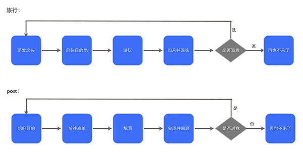 现在我们把之前的旅行的步骤放到post表单设计中,我们可以得到如下思路:
