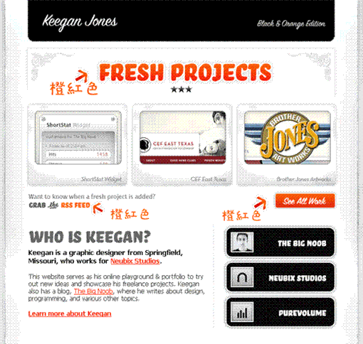 学习设计的人都想做出好东西,但是往往却事与愿违,从手下出来的作品总是不能达到自己的要求。其中对色彩比例的取舍上总是犹豫不决,结果往往是做出错误的判断。到底我们要怎么做才能做出漂亮的色彩呢。从比例的安排上可以帮助我们得到部分答案!下面看图:以下是一外国网站的截图,这个网站用的色彩不多,白色,黑色,橙红色。不用我说大家都知道什么色彩最多,什么彩色最少!