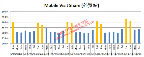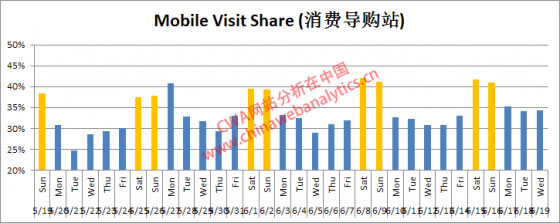 如果把每天mobile占总流量的比例做一个趋势,会发现周末非常重要!老外们回到家中使用PC的趋势降低了。