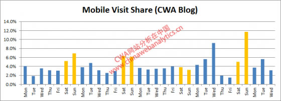 看起来同样有一个大致的三分之一左右的比例是来自于mobile的访问。那么,周末仍然比平日有更大的渗透率吗?