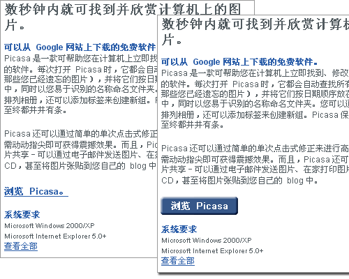 不区分真、伪按钮的做法需要我们花更多的心思判断哪些文字链接是可以被“升级”为按钮的。因为把文字链接“升级”为按钮意味着他很重要,而一个页面上不应该有很多重要的内容。同时,按钮上的文字表述也是需要花很大精力的,尤其是对于我们。我相信,在中国多数的网页设计师,象我一样,并不具备很强的文字表达能力。在按钮上显然又不可以长篇大论,要用几个字描述清楚点击后的效果并不简单。但是,却很必要。