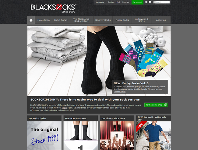 从电商网站的整体设计来说,大多都遵循了京东、亚马逊这种大而广的方式,当然这也和他们自身的经营模式有关。但也不乏一些单一品类的小清新的电商网站,其设计风格与京东完全不同。国外有一家专家卖袜子的blacksocks,国内也有模仿者。其设计风格看上去更象一个企业网站。