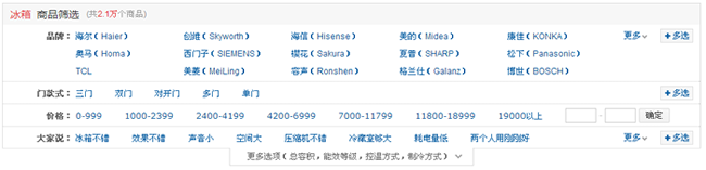一般电商网站根据用户检索的商品种类进行相关的SKU属性展示,不同品类的商品具有不同的SKU属性。如下图是京东的冰箱类商品检索: