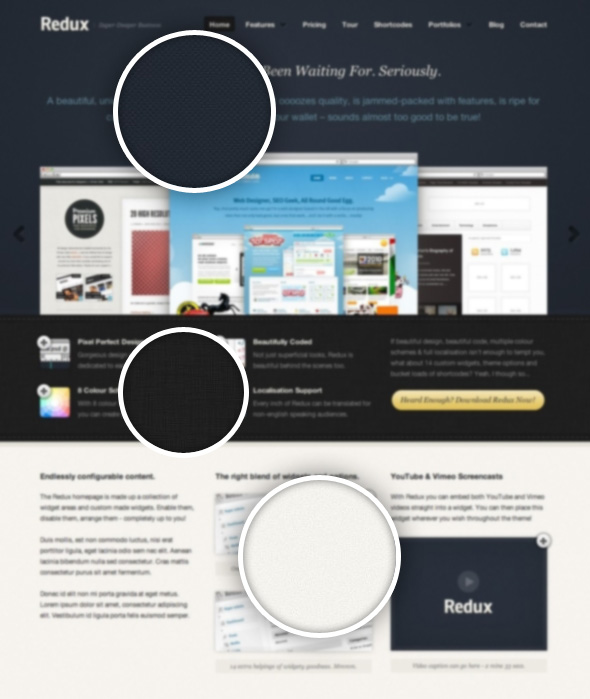 前一段时间在企业管理界流行一句格言叫”细节决定成败”。企业管理当然不是我们这里要讨论的主题,但是,把这句话放在网页设计当中的确是颠扑不破的真理。我们的眼睛和感觉总是非常敏锐的,即使是完全不了解网页设计技术的人也能够从一堆拙劣的设计作品当中挑选出那一个优秀的设计作品。虽然他说不出来为什么这件东西比那些都好,但是直觉会告诉他他自己喜欢哪一个。如果别人向我们问起为什么这件作品要优于其它呢?我们的回答是”很大一部分原因是因为优秀的设计作品总是充满了丰富的细节。”在这篇文章里,我们就从技术的角度出发,以PremiumPixels上的Redux WordPress主题设计作品为例,来总结一下在网页设计中到底是哪些细节让优秀的作品脱颖而出。