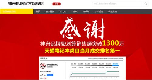 近日,神舟再次发力天猫线上销售渠道,天猫聚划算为神舟量身打造神舟,独设神舟聚划算专场,各系列产品皆以亲民价钜惠于民,深得广大用户好评与支持,使得神舟在短短两天时间内销售额就突破1300万左右,一举拿下天猫近一个月笔记本类目下销售额第一、访客数第一、流量第一,这三个第一是用户对神舟电脑产品的认可,对神舟电脑品牌的信赖和对神舟电脑未来的期待。