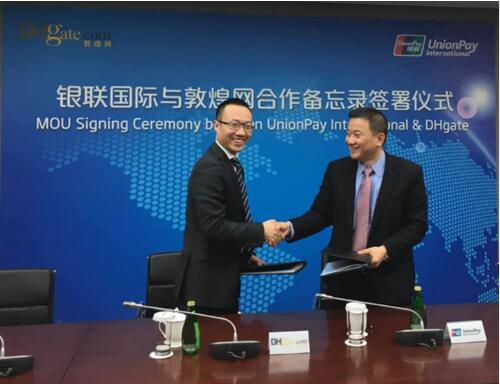 2月26日,敦煌网与银联国际达成跨境网上业务合作,开通敦煌网全面受理银联卡(卡号以62开头)。敦煌网副总裁王添天、银联国际首席业务发展官王立新共同出席签约仪式。