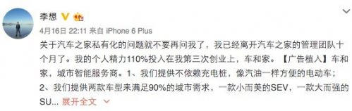 4月16日晚,李想通过个人实名认证微博发文称,自己已经离开汽车之家管理团队10个月,有关私有化的问题就不要来问了。并且介绍了自己目前正在进行的第三个创业项目。