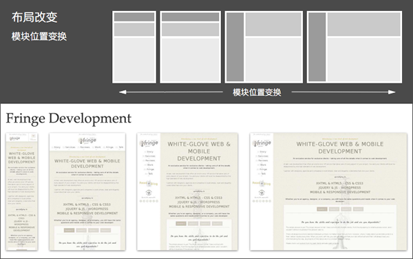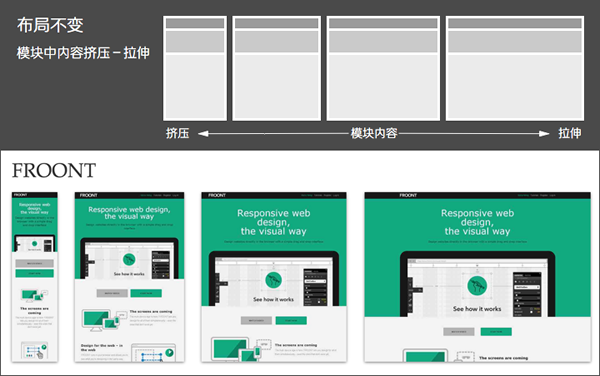 可切换的固定布局:同样以像素作为页面单位,参考主流设备尺寸,设计几套不同宽度的布局。通过设别的屏幕尺寸或浏览器宽度,选择最合适的那套宽度布局;