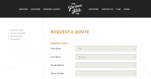 复杂一点表格看Prince Ink quote form网站,页面分为4部分。
