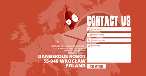 Dangerous Robot 网站的设计跟上一个不同,联系表格与其他元素通过明亮的暖色和矢量图案很好的融合在一起。联系表格基本采取居中模式,每个框里加上图标,使得辨识度和阅读速度得到提高。