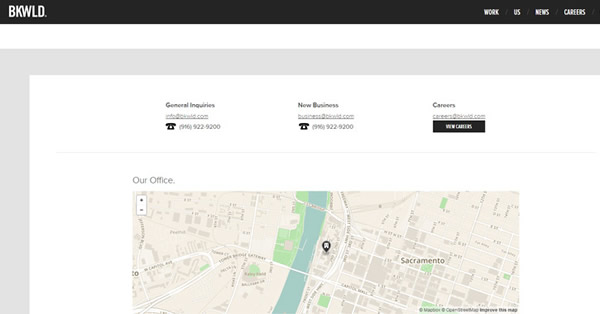 BKWLD的联系页,除了一些基本的邮件/电话信息,添加了MAPbox动态地图,调高了交互性。
