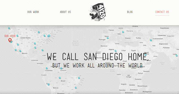 也可以考虑使用一个定制的照片,不用javascript地图。在FortyOneTwenty网站联系页面,使用一个世界地图,上面的蓝点标注了全球分公司和员工分布情况。