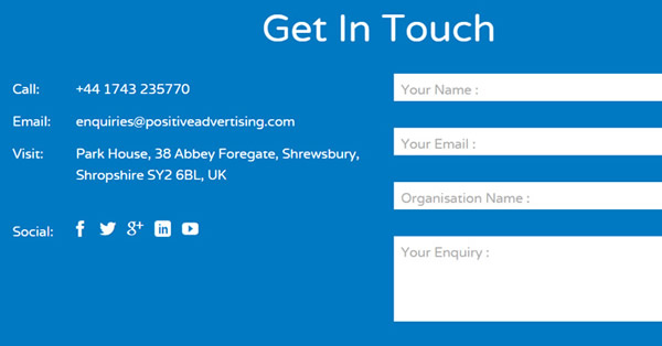 Positive Advertising网站的社交账号图标设置的比较小。这个网站是单网页网站。社交账号图标位于电话号码,电子邮件地址和邮寄地址的下面。图标采取了统一的单色处理。