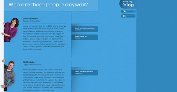 Blue Sky Resumes网站的“关于我们”页面包含一段团队的介绍。每个雇员都有自己单独的网页链接。