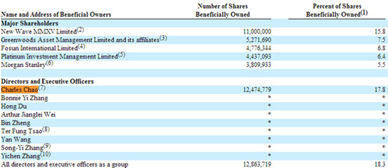 截止到2016年3月31日,曹国伟一共持有12,474,779股,持股比例为17.8%,其中, 曹国伟通过New Wave MMXV Limited持有11,000,000股,这部分占新浪总股本的15.8%。