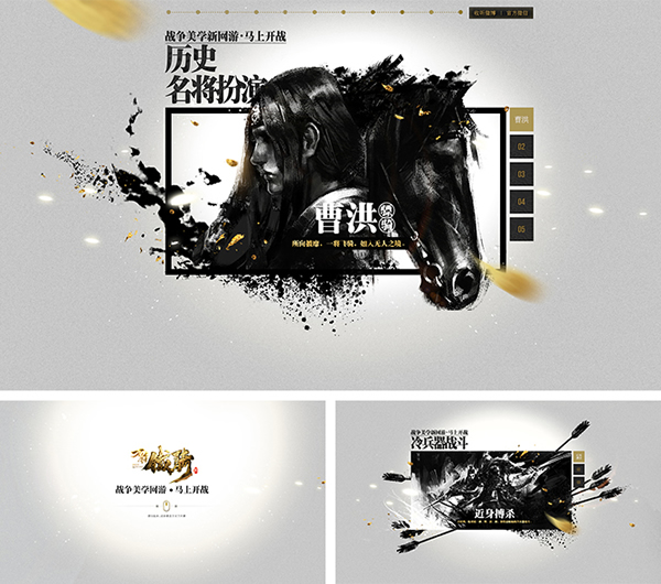 如:刀锋铁骑品牌站,采用黑金两色,将这款冷战争网游,用最简单的方式表现最纯粹的视觉,更加有感染力。