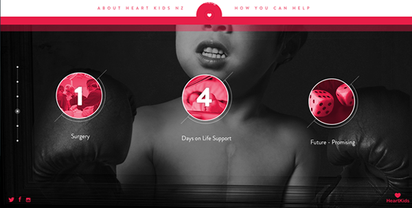 这是新西兰慈善组织Heart Kits 的网站。长滚动页面设计和动画结合到一起,滚动操作可以激活动画,令人惊艳的色调,凄美的意象,组织到一起宣扬拯救生命的信息。