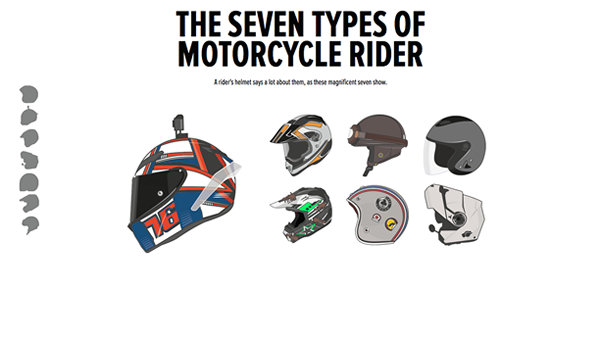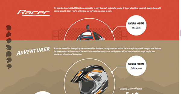 这个长滚动页面在左侧使用灰色的头盔来作为导航和提示,用户向下滚动可以看到堆叠的页面逐步翻看,呈现内容。