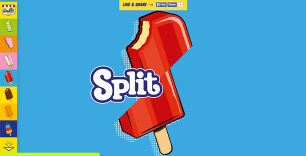 与上一个案例截然相反,这个名为Wall’s Ice Cream & Airpure Car Fresheners 的网页采用了华丽的设计,色彩鲜艳变化多端的小雪糕被设计成导航,随着页面向下滚动你会看到有趣的动画。注意底部进度条的色彩变化和固定的导航设计。