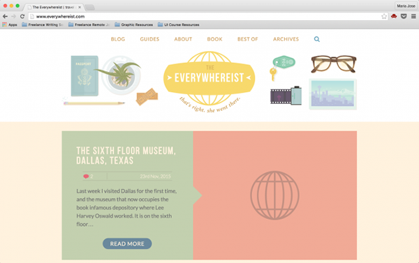 博客The Everywhereist 的博主是一位重度旅游爱好者,她和她丈夫经常满世界溜达,留下他们的印记,并在博客上直播他们的旅行。护照、地图、胶卷都是他们在全世界旅游的明证,而博客Banner图上的这些元素也足够让你信服。