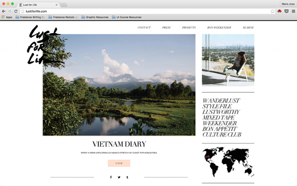 The Wanderlust Project 的页头就用了一种非常有性格的手写风字体来书写标题,这不仅非常抓眼球,而且当字体运用到配图当中之后,显得网站还很有一致性。