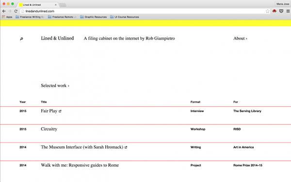 和保持简约的风格不同,Lined and Unlined 的网站设计更偏向于极简化的设计,最大限度的简化整体设计,字体和色彩尽量简单,让真正有趣的内容凸显出来。