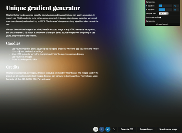 Unique Gradient Generator 是一个独特的渐变背景产生器,跟一般 CSS 渐层背景语法功能不同,透过这项服务可以从网站提供的免费图库来挑照片,或是自己上传,选择要模糊显示范围。因为是放大显示,仅会提取图片上非常小的区域,将它扩展到 100% 大小,利用浏览器图片平滑算法来产生最佳效果。