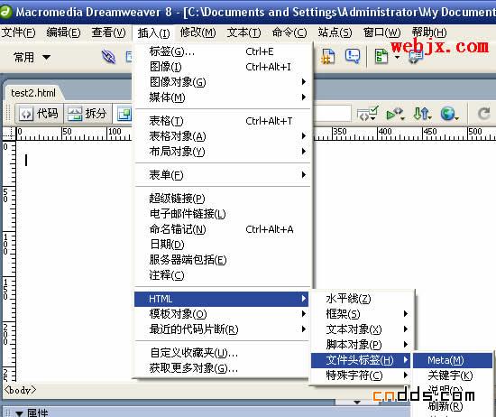 2、单击菜单栏中的插入-HTML-文件头标签-Meta,会弹出Meta对话框。