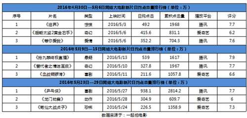 正是基于这样一种考量和认知,目标定位准确的腾讯视频,在网络大电影的布局上,可谓厚积薄发。从开年的《再见美人鱼》为始,凭累积破亿次的播放量打响网大战役后,后续网大一直呈现持续上扬的态势。据“一起拍电影”的官方数据显示,在5月每周新片日均点击量排行榜上,腾讯视频凭借《临界》《替代者之情迷画皮》《拾九禁终极直播》《乒乓侠》等优质网大,成功脱颖而出,5月有三周霸占了周榜日均点击量头首,细分到同期上线的网络大电影看,点击量均领航其它平台网大,质量优势明显。